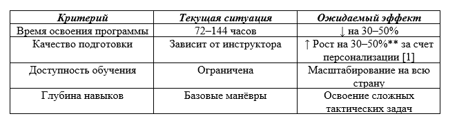 Традиционное обучение строится на «среднем» уровне группы. ИИ же анализирует индивидуальный стиль пилотирования, выявляет слабые зоны (например, нестабильность на высокой скорости или промедление при активации тепловизора) и строит уникальную траекторию развития. Как показывают исследования в сфере цифрового образования [1], это повышает эффективность обучения на 30–50%.